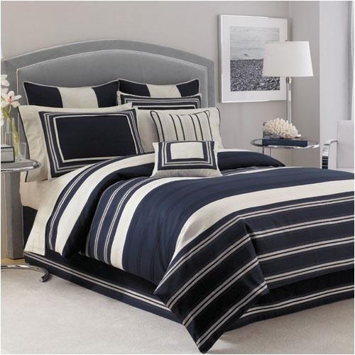 Nautica's classic design heritage is evident in St. Petersburg, a fashionable bedding ensemble in navy and oyster white sateen jacquards. An elegantly striped comforter creates a subtle tone on ton herringbone pattern which is echoed in the euro shams. The square toss incorporates fabrics from the comforter, one having a clean border and solid center and the other offering pieced vertical stripes.
