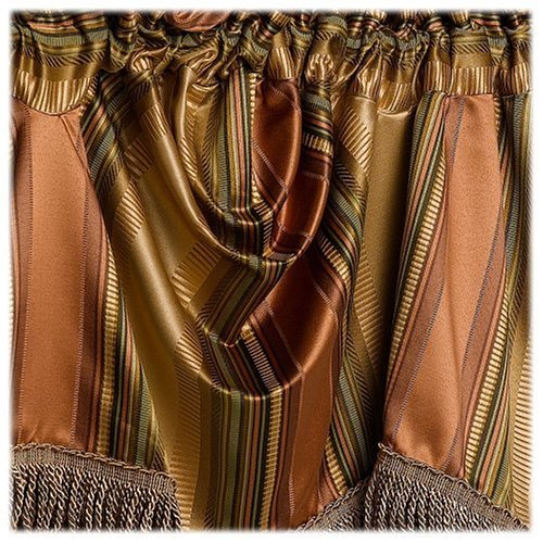 Croscill's "Carrington Stripe" Austrian swag valance adds elegance to your windows. Copper, green, taupe and bronze jacquards are luxuriously woven into broad stripes giving this pattern a feeling of strength and modern elegance. Lavishly trimmed with a bouillon fringe in gold, the valance has a 3 inch header on top of the 3 inch continental rod pocket.