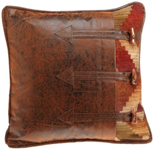 Croscill's "Santa Fe" is a rustic southwestern ensemble in a warm desert palette of cayenne, sage, sand and rust. The main print is reminiscent of tradition Navajo designs. The decorative pillows feature unique embellishments including distressed leather, buckles and embroidery. The face of the square pillow features a colorful Navajo diamond band, distressed leather, horn buttons and leather straps, making it truly unique. The back side of the pillow is distressed leather, giving this pillow two looks. A 3/8-inch leather piping trimming all edges gives it a clean finish. The "Santa Fe" square pillow measures 16-inch wide by 16-inch tall and has 100-percent virgin polyester fiberfill.