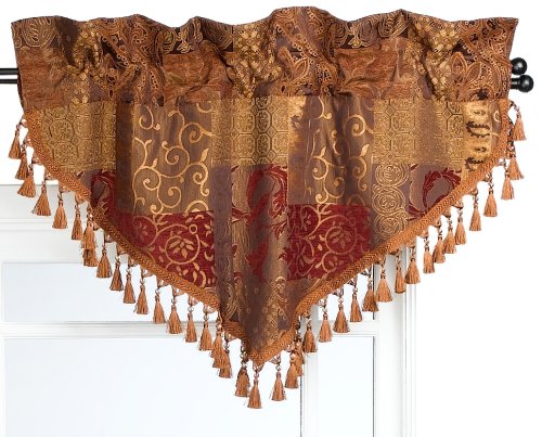 Croscill's "Galleria" ascot valance is a beautiful way to dress up any window of your home. The ascot valance features a rich patchwork jacquard that combines damask, paisley, and a lattice motif, all in tones of red, bronze, and gold. The "Galleria" ascot valance has a rich, luxurious tassel fringe that runs along both sides of the valance. The four inch tassels on this trim are further detailed with a single bead over each tassel. The ascot valance measures 40 inches wide by 21 inches long and has a 3 inch header. The 3 1/4 inch rod pocket allows for use with both decorative and continental rods. Top off your window with the "Galleria" ascot valances, or add them to the "Galleria" pole top drapes. It is recommended that one ascot be used for every 18 inches of window. Hand wash.